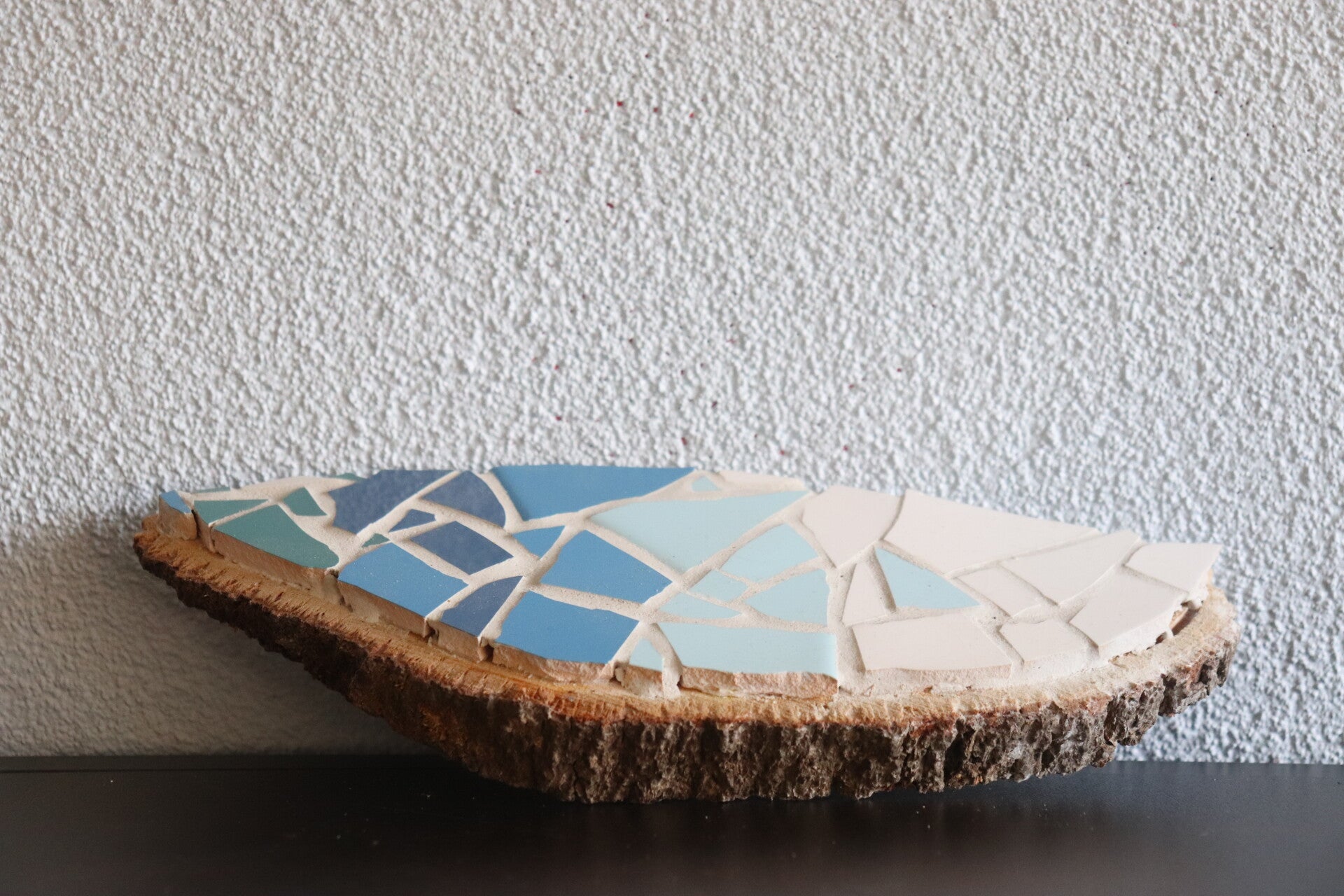Een abstract in blauw op een plak eikenhout. Een origineel DIY woonaccessoire cadeau.