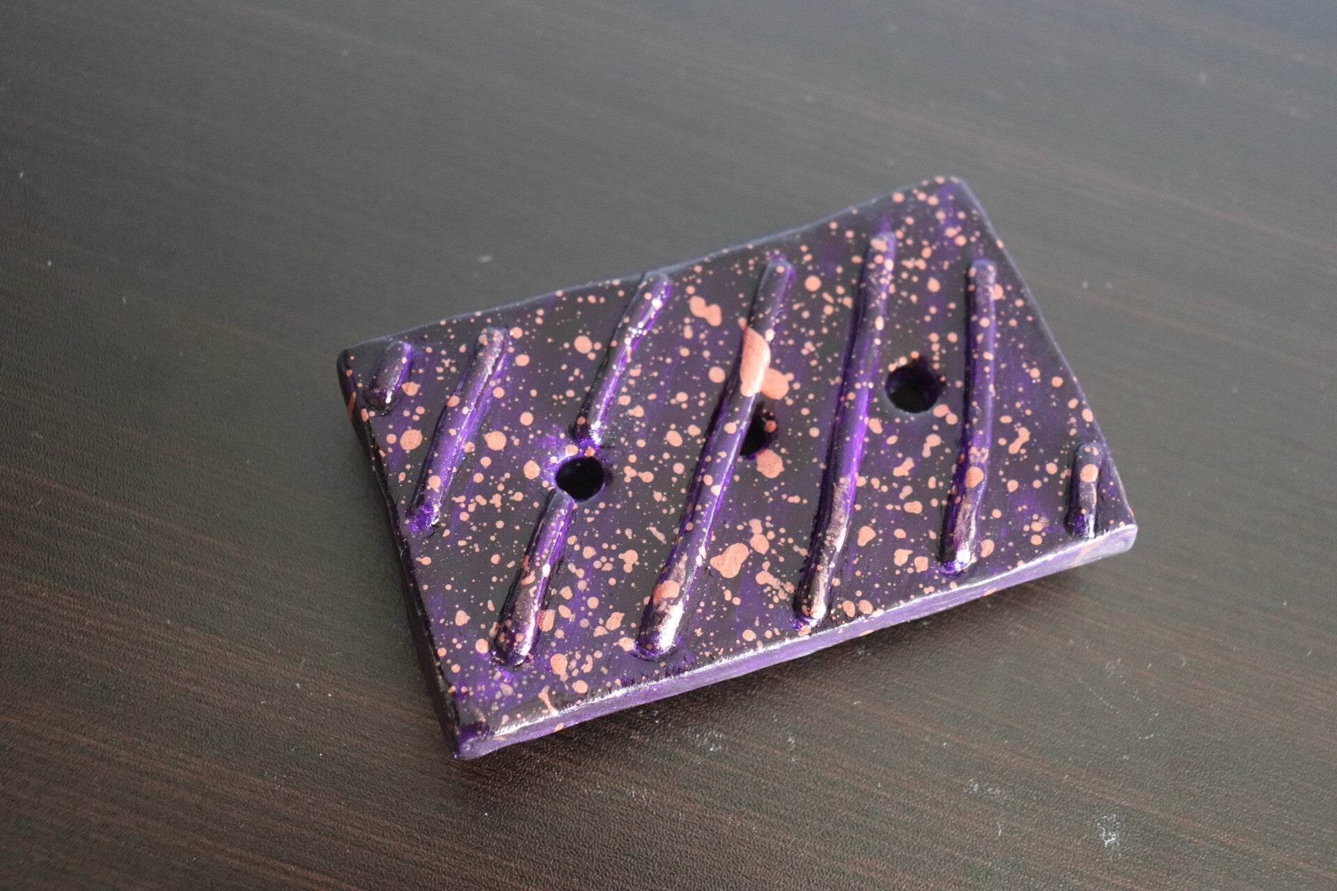 Naar eigen ontwerp. Deze is gemaakt in klei, geverfd in paars en kreeg bronskleurige spots mee. Uiteraard is deze gevernist en zal het mooi doen op een wastafel of aanrecht.