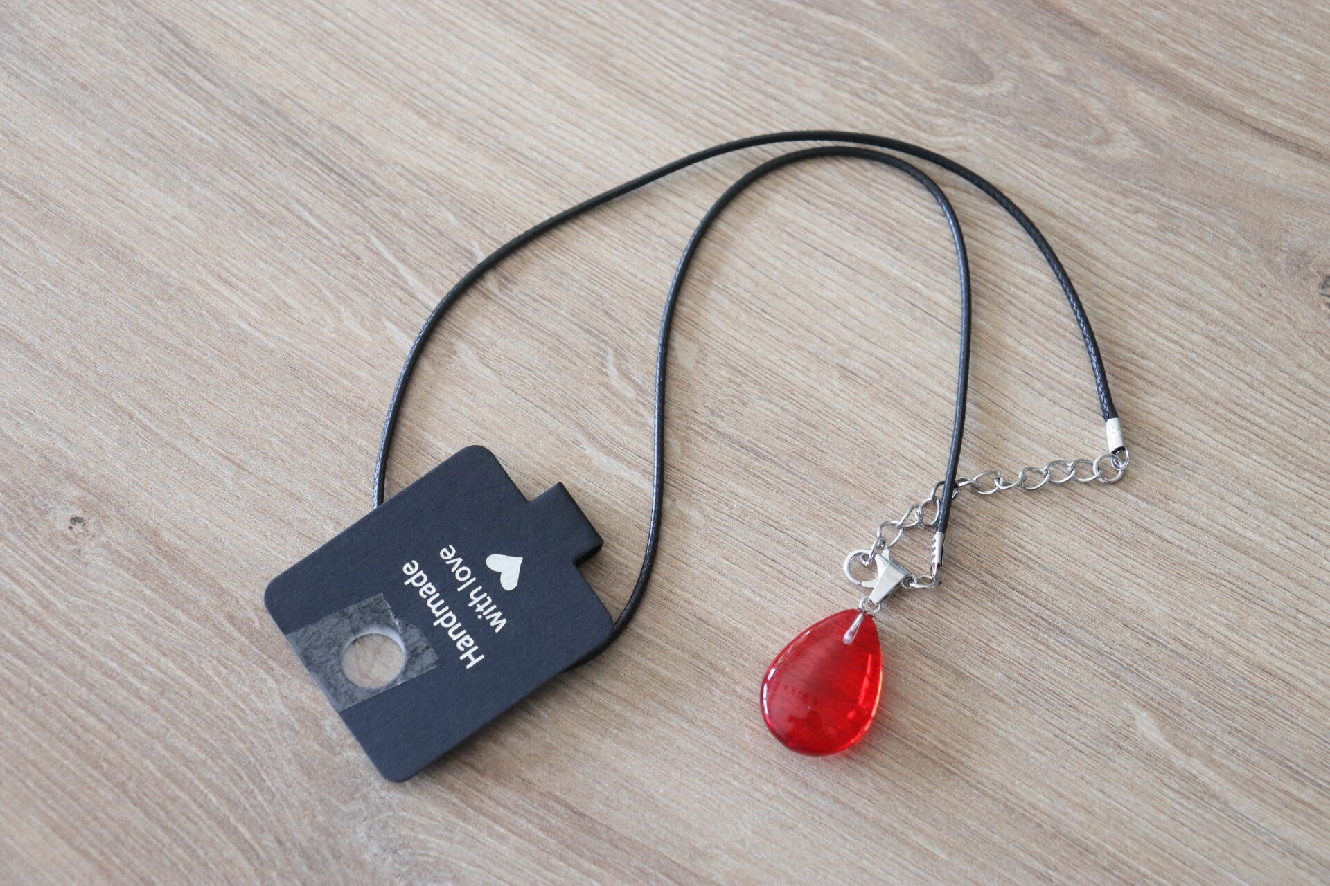 Een vurig rode steen aan een zwarte ketting. Maak uw outfit compleet met deze blikvanger!